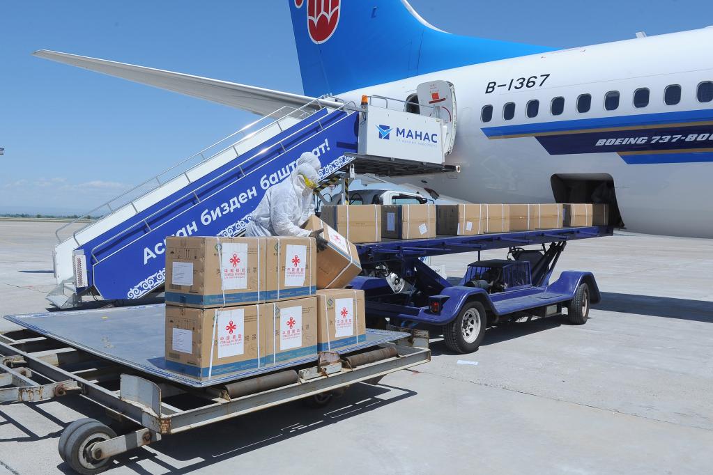 2020年5月11日,在吉爾吉斯斯坦首都比什凱克,中國政府第二批援吉抗疫醫(yī)療防護(hù)物資抵達(dá)瑪納斯國際機(jī)場。新華社發(fā)(吉爾吉斯斯坦政府新聞局供圖)