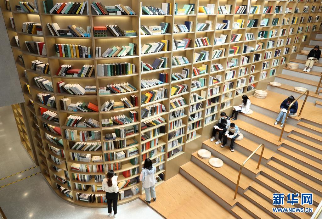 2021年5月2日,讀者在安徽省蒙城縣圖書(shū)館天梯書(shū)架旁閱讀書(shū)籍。新華社發(fā)(胡衛(wèi)國(guó) 攝)