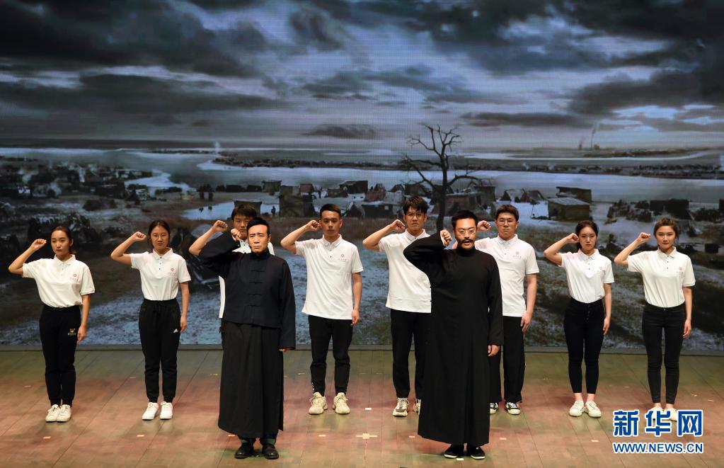 2021年4月20日,在電視劇《覺(jué)醒年代》主創(chuàng)團(tuán)隊(duì)走進(jìn)北大活動(dòng)中,劇中陳獨(dú)秀扮演者于和偉(前左)、李大釗扮演者張桐(前右)與北大學(xué)生同臺(tái)演出。新華社記者 任超 攝