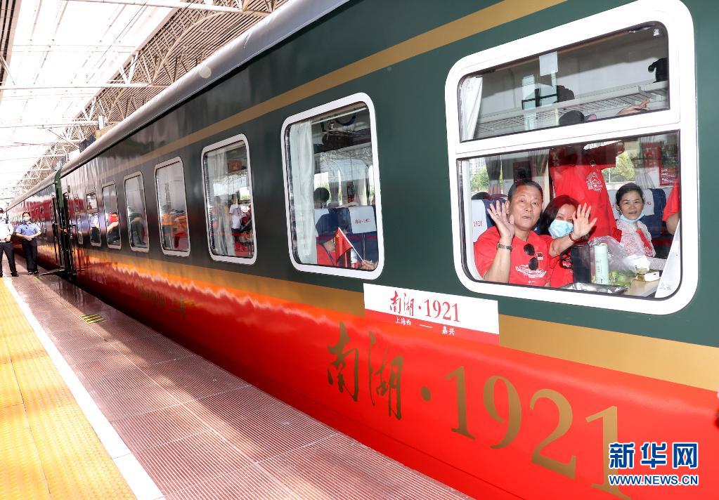 2021年6月25日,乘坐Y701次“上海至嘉興紅色旅游列車(chē)”的旅客在鐵路上海西站準(zhǔn)備出發(fā)。這是一趟紅色教育主題列車(chē),連接起上海中共一大會(huì)址與嘉興南湖。新華社記者 陳飛 攝