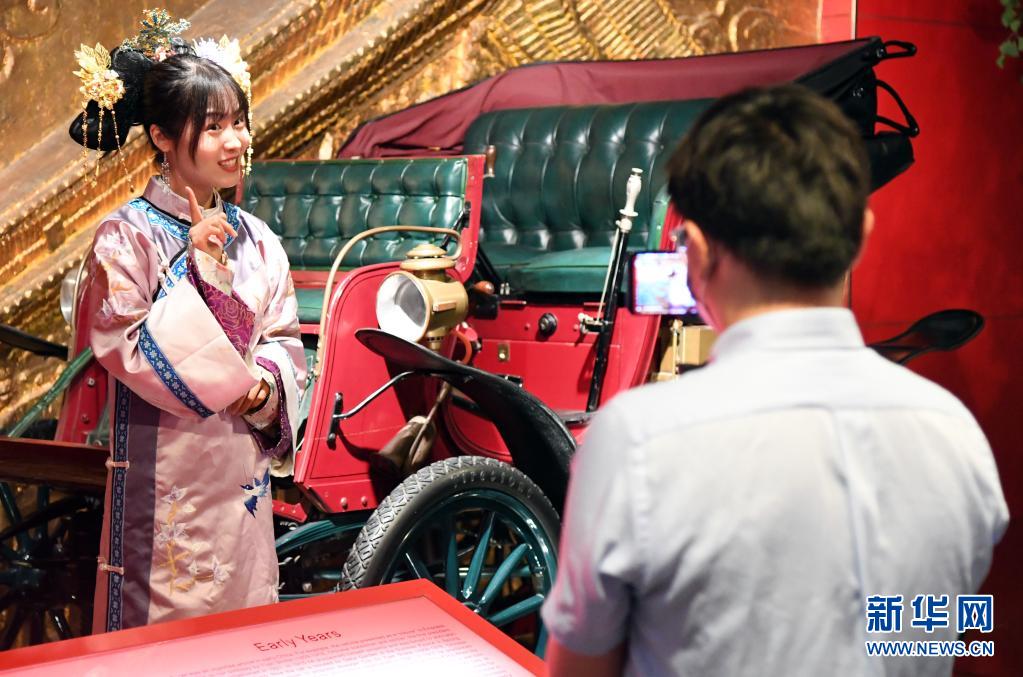 2020年5月18日,在北京汽車(chē)博物館,曾紅娟(左)用講故事的方式通過(guò)網(wǎng)絡(luò)直播平臺(tái)為觀眾介紹藏品車(chē)。新華社記者 任超 攝