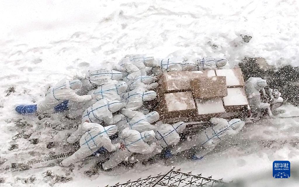 大連海洋大學(xué)的志愿者推著滿(mǎn)載的三輪車(chē)上坡,將物資送到學(xué)生宿舍(2021年1月6日攝)。新華社發(fā)(大連海洋大學(xué)供圖)