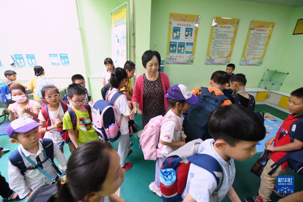 福建省福州市鼓樓區(qū)東街街道軍門(mén)社區(qū)黨委書(shū)記林丹來(lái)到軍門(mén)社區(qū)“陽(yáng)光朵朵”少兒托管中心看望放學(xué)后在這里托管的小朋友(6月23日攝)。新華社記者 林善傳 攝