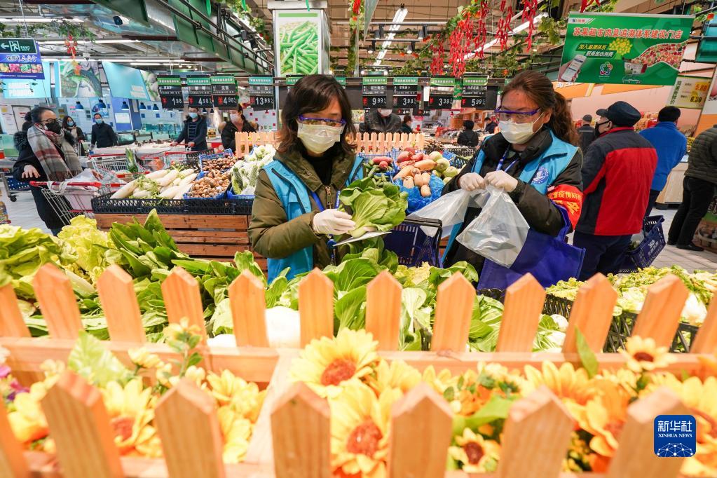 南京市建鄴區(qū)南苑街道興達社區(qū)的網格長范璐(左)和同事在超市為轄區(qū)內居民代購蔬菜(2020年2月17日攝)。新華社記者 李博 攝