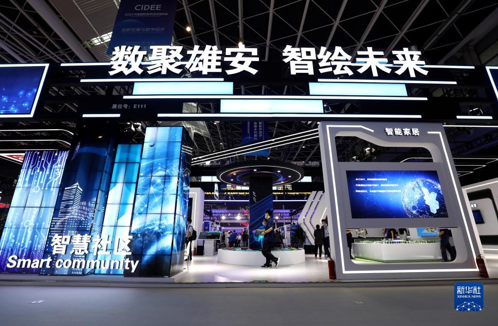 9月6日,參觀者在2021中國國際數字經濟博覽會上參觀“數聚雄安 智繪未來”雄安展區(qū)。新華社發(fā)(梁子棟 攝)