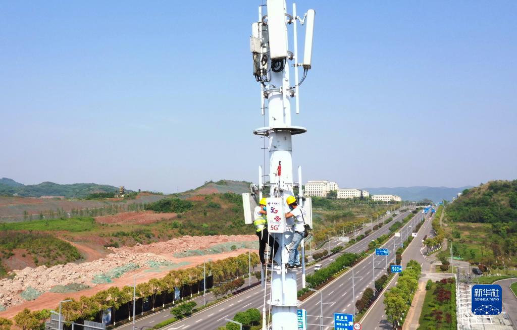 工作人員在位于重慶高新區(qū)高新大道的5G基站建設現場作業(yè)(2020年4月15日攝,無人機照片)。新華社記者 王全超 攝