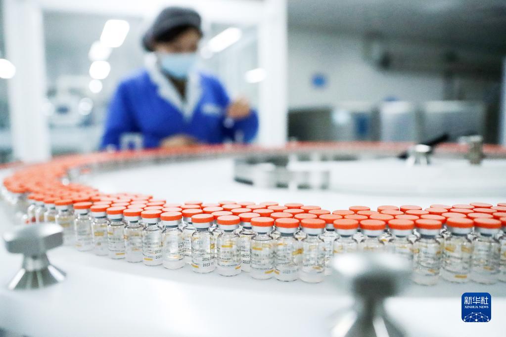 1月6日,科興中維的工作人員檢查自動西林瓶包裝線上新冠病毒滅活疫苗標簽。新華社記者 張玉薇 攝