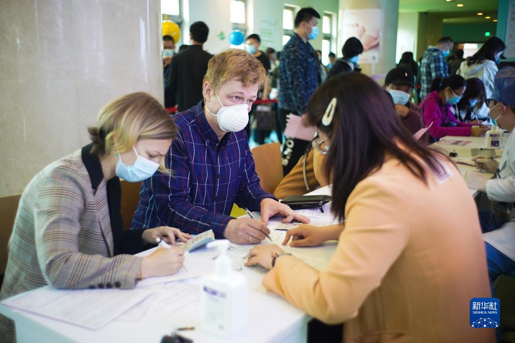 4月15日,在位于北京經濟開發(fā)區(qū)的一處新冠疫苗接種點,外籍人士接種新冠疫苗前填寫個人信息。新華社記者 彭子洋 攝