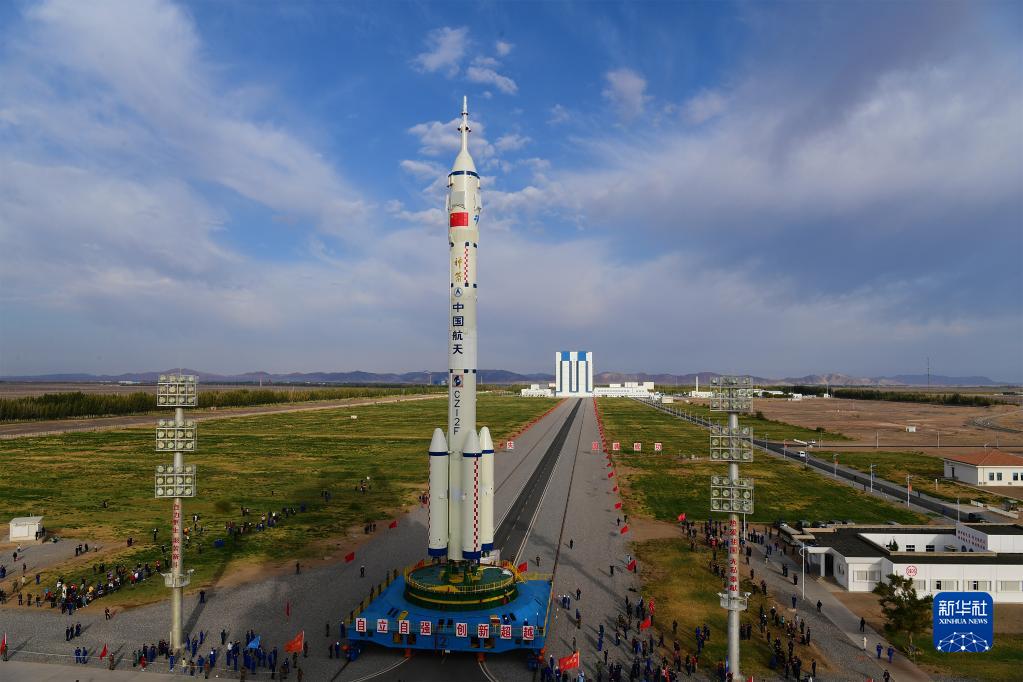 10月7日,神舟十三號載人飛船與長征二號F遙十三運載火箭組合體準(zhǔn)備轉(zhuǎn)往發(fā)射區(qū)。新華社發(fā)(汪江波 攝)