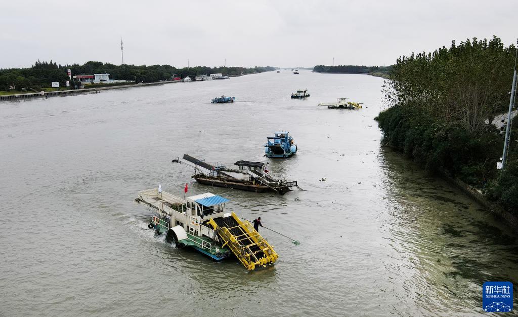 蘇浙滬三地的保潔船在位于長(zhǎng)三角生態(tài)綠色一體化發(fā)展示范區(qū)的蘇浙滬交界水域太浦河流域聯(lián)合清理水面浮游植物(2020年10月15日攝,無(wú)人機(jī)照片)。新華社記者 方喆 攝