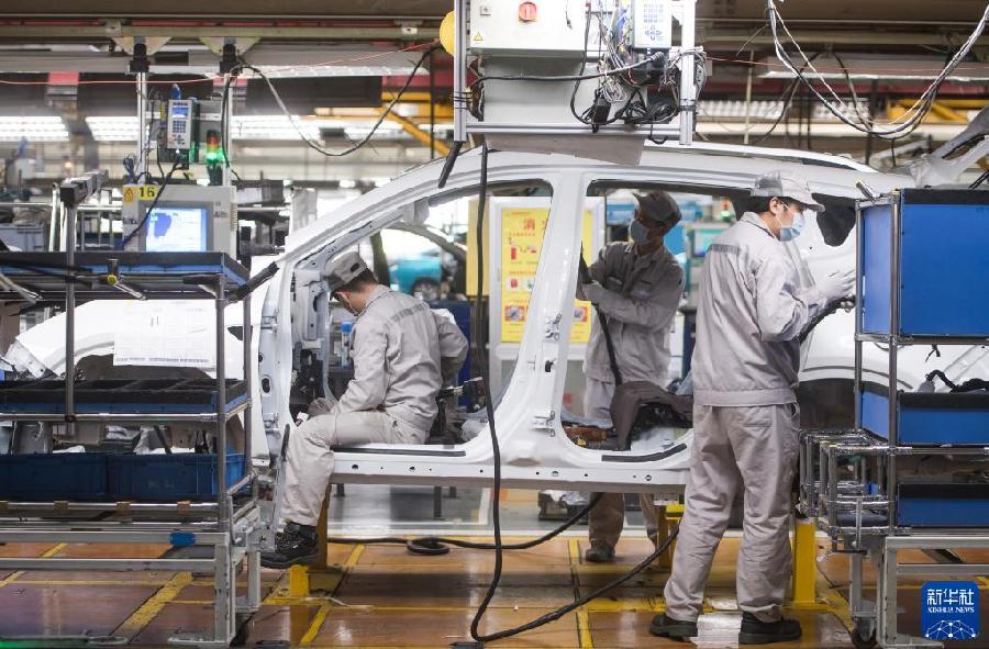 2020年3月24日,工人在湖北武漢東風(fēng)乘用車公司工廠總裝車間的流水線上作業(yè)。2020年3月下旬左右,武漢各企業(yè)開始陸續(xù)復(fù)工復(fù)產(chǎn)。新華社記者 肖藝九 攝
