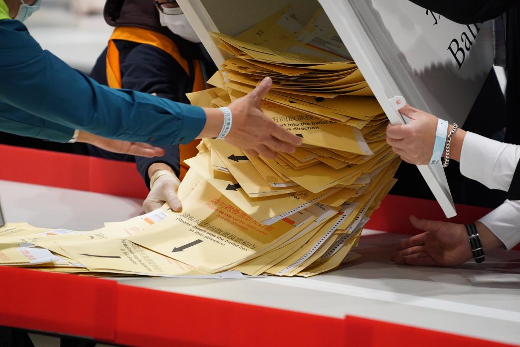 12月19日,香港順利舉行完善選舉制度后首次立法會(huì)選舉投票,工作人員點(diǎn)票現(xiàn)場(chǎng)。新華社記者 呂小煒 攝