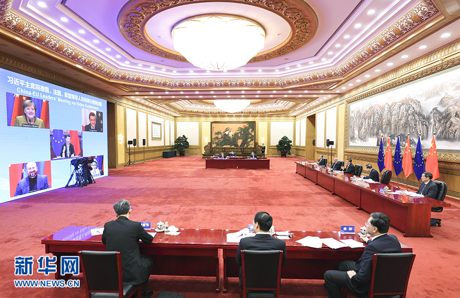 12月30日晚,國家主席習(xí)近平在北京同德國總理默克爾、法國總統(tǒng)馬克龍、歐洲理事會主席米歇爾、歐盟委員會主席馮德萊恩舉行視頻會晤。中歐領(lǐng)導(dǎo)人共同宣布如期完成中歐投資協(xié)定談判。 新華社記者 李學(xué)仁 攝