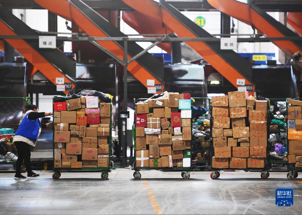 在中國(guó)郵政集團(tuán)有限公司河南省鄭州郵區(qū)中心,工作人員在轉(zhuǎn)移快遞包裹(11月11日攝)。新華社記者 張浩然 攝