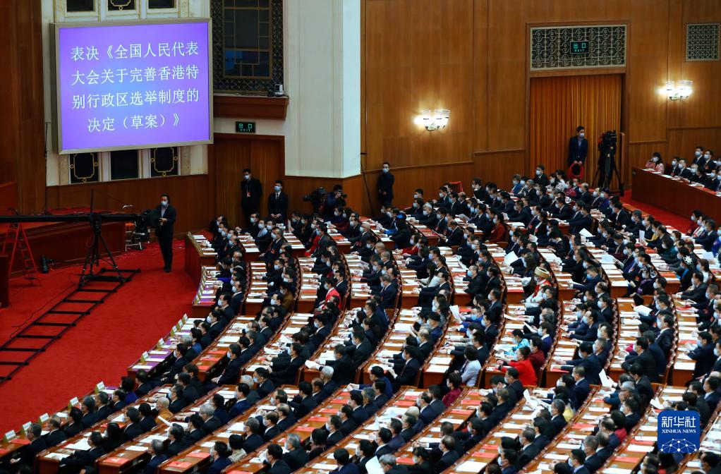 3月11日,十三屆全國人大四次會議表決通過《全國人民代表大會關(guān)于完善香港特別行政區(qū)選舉制度的決定》。這是繼制定實施香港國安法后,中央依法治港的又一重大舉措,是完善“一國兩制”制度體系、落實中央對香港全面管治權(quán)的具體體現(xiàn),為全面落實“愛國者治港”原則提供了更加堅實的制度保障。3月30日,十三屆全國人大常委會第二十七次會議通過了新修訂的香港基本法附件一和附件二。隨后,香港特別行政區(qū)完成本地立法。新選舉制度為推進(jìn)香港民主穩(wěn)步發(fā)展、實現(xiàn)良政善治,促進(jìn)“一國兩制”實踐行穩(wěn)致遠(yuǎn)打下堅實基礎(chǔ)。