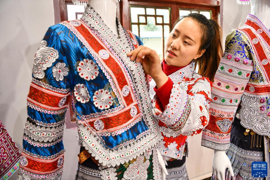 在貴州省畢節(jié)市黔西縣新仁苗族鄉(xiāng)化屋村麻窩寨易地扶貧搬遷集中安置點(diǎn),苗族繡娘楊文麗整理苗族服飾(2021年2月20日攝)。新華社記者 楊文斌 攝