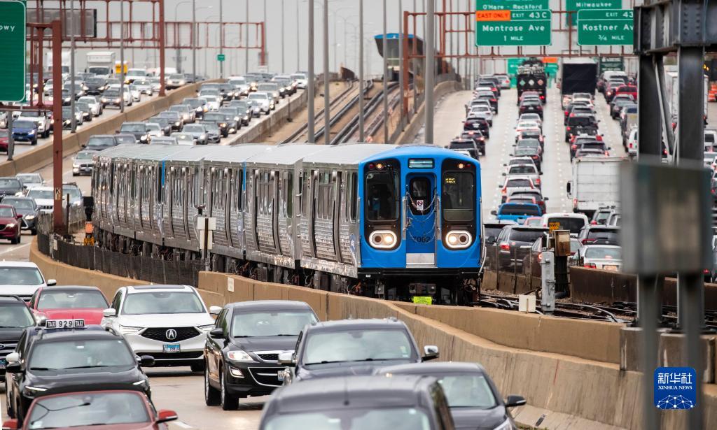 2021年5月6日,掛有7000系列車廂的地鐵列車在美國芝加哥載客試運行。7000系列地鐵車廂由中國中車青島四方機(jī)車車輛股份有限公司(中車四方)在美國制造組裝。新華社發(fā)(喬爾·萊納 攝)