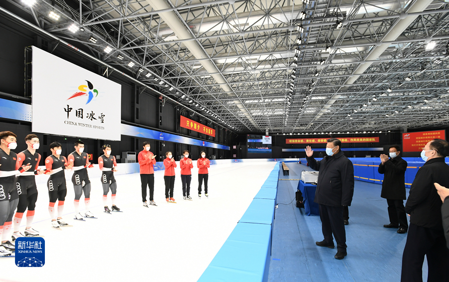 2022年1月4日,中共中央總書記、國家主席、中央軍委主席習近平在北京考察2022年冬奧會、冬殘奧會籌辦備賽工作。這是4日下午,習近平在二七廠冰雪項目訓練基地速滑館,向參訓運動員、教練員表示慰問。新華社記者 謝環(huán)馳 攝