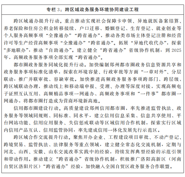提升政務服務便利度。加快推進政務服務標準化,持續(xù)優(yōu)化《河南省政務服務事項基本目錄》,制定全省統(tǒng)一的政務服務標準化實施細則,全面建成與國家和行業(yè)標準體系協(xié)調(diào)一致、結(jié)構(gòu)統(tǒng)一,覆蓋省、市、縣、鄉(xiāng)、村五級的政務服務標準化體系,實現(xiàn)同一事項全省無差別受理、同標準辦理,爭創(chuàng)一批政務服務標準化國家級試點。優(yōu)化再造政務服務流程,持續(xù)壓縮政務服務事項辦理時限,全面推行一窗通辦、一網(wǎng)通辦、全程網(wǎng)辦服務模式,推出一批憑營業(yè)執(zhí)照和居民身份證可自助辦理的“無人審批”事項,推動實現(xiàn)全省除涉密之外的所有政務服務事項實行“不見面審批”、市縣級政務服務事項“一窗”分類受理全覆蓋?!笆奈濉逼陂g,普通高壓客戶辦電環(huán)節(jié)壓縮至4個以內(nèi),其中符合投資至規(guī)劃紅線要求的辦電環(huán)節(jié)壓縮至3個以內(nèi),對通過工商信息推送“主動辦電”的辦電環(huán)節(jié)壓縮至2個以內(nèi)。用水、用氣報裝(含施工)環(huán)節(jié)分別壓縮至2個、3個。精簡辦事材料,全面清理證明事項和推行證明事項告知承諾制,推廣應用以信用為基礎(chǔ)的容缺受理機制,創(chuàng)建一批“無證明城市”。創(chuàng)新政務服務模式,探索無人工干預的智慧審批、“無感智辦”等新模式,逐步拓展“秒報”“秒批”服務事項范圍和“最小顆?;闭辗帐马椄采w面,加快互聯(lián)網(wǎng)應用適老化及無障礙改造升級。實施跨區(qū)域政務服務通辦提升行動,聚焦保障改善民生,加快統(tǒng)一通辦業(yè)務規(guī)則和標準,優(yōu)化通辦業(yè)務模式,推動更多政務服務事項“同事同標”,實現(xiàn)企業(yè)和群眾高頻事項“全豫通辦”“跨省通辦”。到2025年,政務服務事項“一網(wǎng)通辦”可辦率、“最多跑一次”實現(xiàn)率均達到100%,出口退稅平均辦理時間壓縮至3個工作日以內(nèi),普通高壓客戶辦電(不含配套工程施工)、用水報裝(含施工)、用氣報裝(小型含外線施工)耗時分別壓縮至18個、10個、10個工作日。