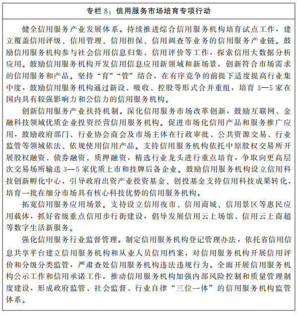 加速培育壯大一批具有較強市場公信力和影響力的信用服務機構(gòu),打造一批特色鮮明、相對集聚的信用服務產(chǎn)業(yè)園區(qū),形成強大的信用生態(tài)鏈。加強信用服務機構(gòu)引進來和“走出去”,引進國內(nèi)外知名信用服務機構(gòu),設立省級征信公司,鼓勵省內(nèi)信用服務機構(gòu)參與國內(nèi)跨區(qū)域信用合作和國際競爭,增加高水平信用服務供給,提升信用服務機構(gòu)規(guī)模優(yōu)勢。