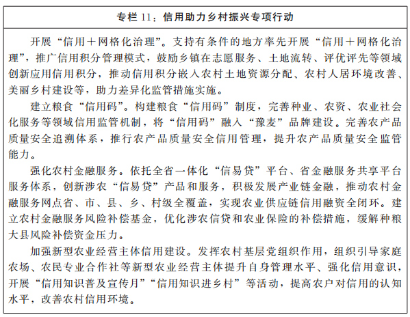 全面推進“信用+鄉(xiāng)村治理”建設,聚焦糧食安全、農(nóng)村金融、新型農(nóng)業(yè)經(jīng)營主體監(jiān)管等領(lǐng)域,創(chuàng)新農(nóng)村信用應用場景和管理模式。深化農(nóng)村金融服務改革,健全農(nóng)村金融服務體系。依據(jù)新型農(nóng)業(yè)經(jīng)營主體發(fā)展目錄,圍繞信貸融資、行業(yè)監(jiān)管、風險防范、利益聯(lián)結(jié)等場景建立新型農(nóng)業(yè)經(jīng)營主體信用評價體系。