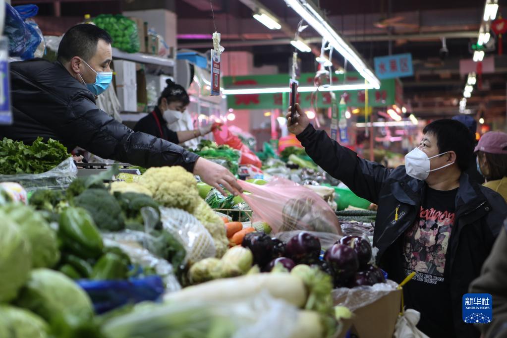 3月25日,在遼寧省沈陽(yáng)市鳳祥綜合市場(chǎng),一名市民買菜后掃碼付款。新華社記者 王乙杰 攝