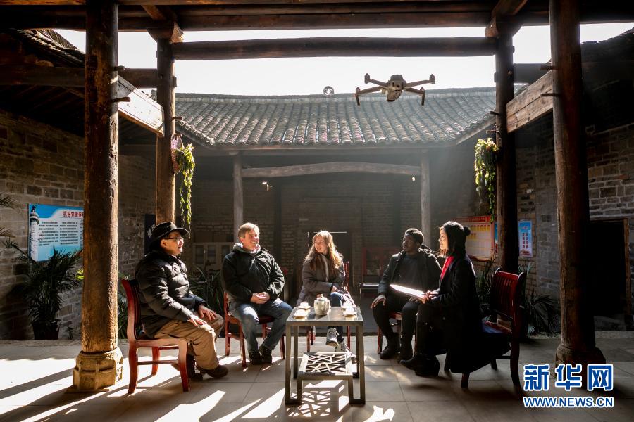 這是新華社記者繆曉娟(右一)在安徽省六安市金寨縣大灣村采訪四位受邀到這里參觀訪問(wèn)的外國(guó)人。左起:植國(guó)明、肖恩、瑞貝卡·尼什、烏俊杰(2020年12月20日攝)。新華社記者郭沛然 攝