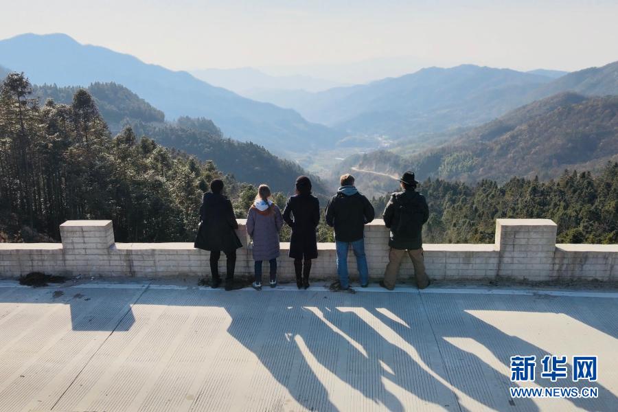 新華社記者繆曉娟和植國(guó)明、肖恩、瑞貝卡·尼什、烏俊杰在山間觀景(2020年12月20日攝,無(wú)人機(jī)照片)。新華社記者 陳諾攝