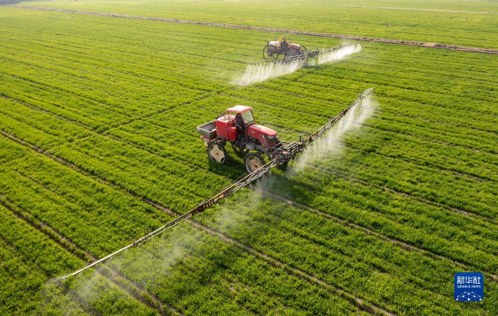 在江蘇省海安市大公鎮(zhèn)賁集村,村民駕駛植保機械在小麥田間進行噴灑藥物作業(yè)(3月9日攝,無人機照片)。新華社發(fā)(翟慧勇 攝)