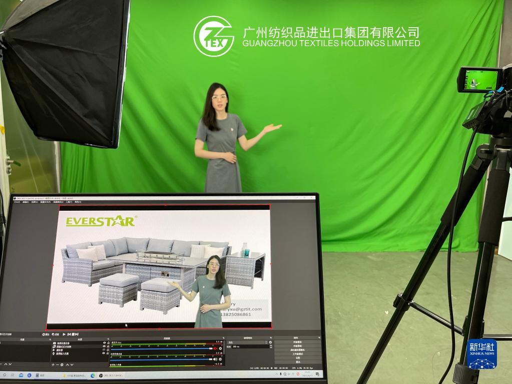 廣州輕工工貿(mào)集團紡織品進出口公司員工利用綠幕技術(shù)排練廣交會上“云展示”(4月11日攝)。新華社發(fā)(受訪者供圖)