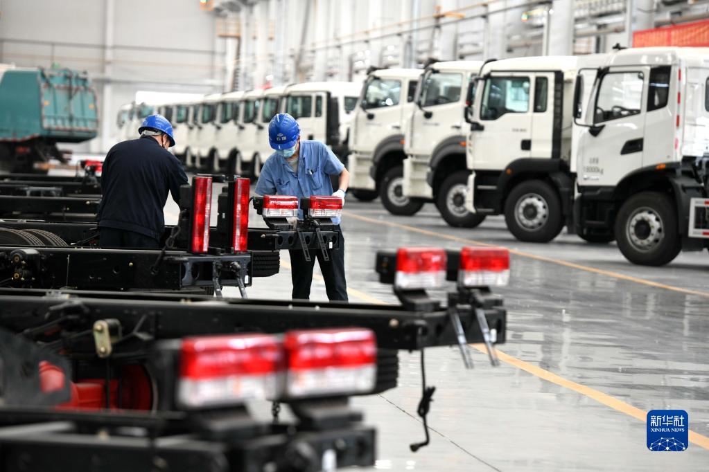 在位于石家莊市欒城區(qū)的石家莊煤礦機械有限責任公司車間內(nèi),工作人員組裝新能源環(huán)衛(wèi)車(4月12日攝)。新華社記者 李繼偉 攝
