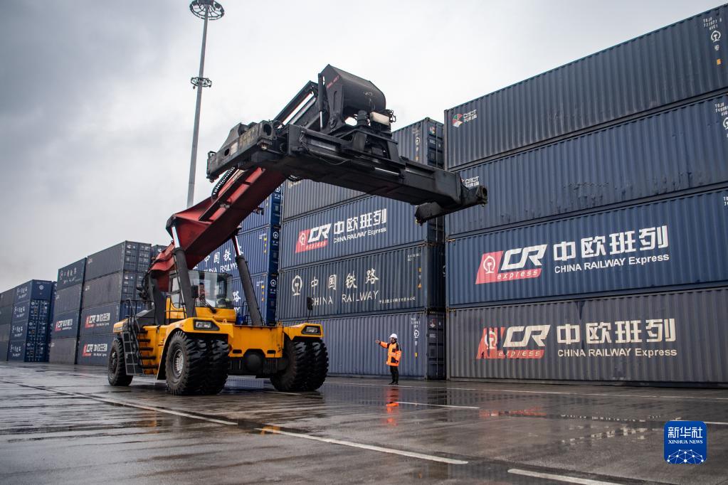中歐班列起點聯(lián)合巡邏隊成員在重慶團結(jié)村中心站貨場對作業(yè)車輛進行現(xiàn)場指揮(1月25日攝)。新華社記者 唐奕 攝