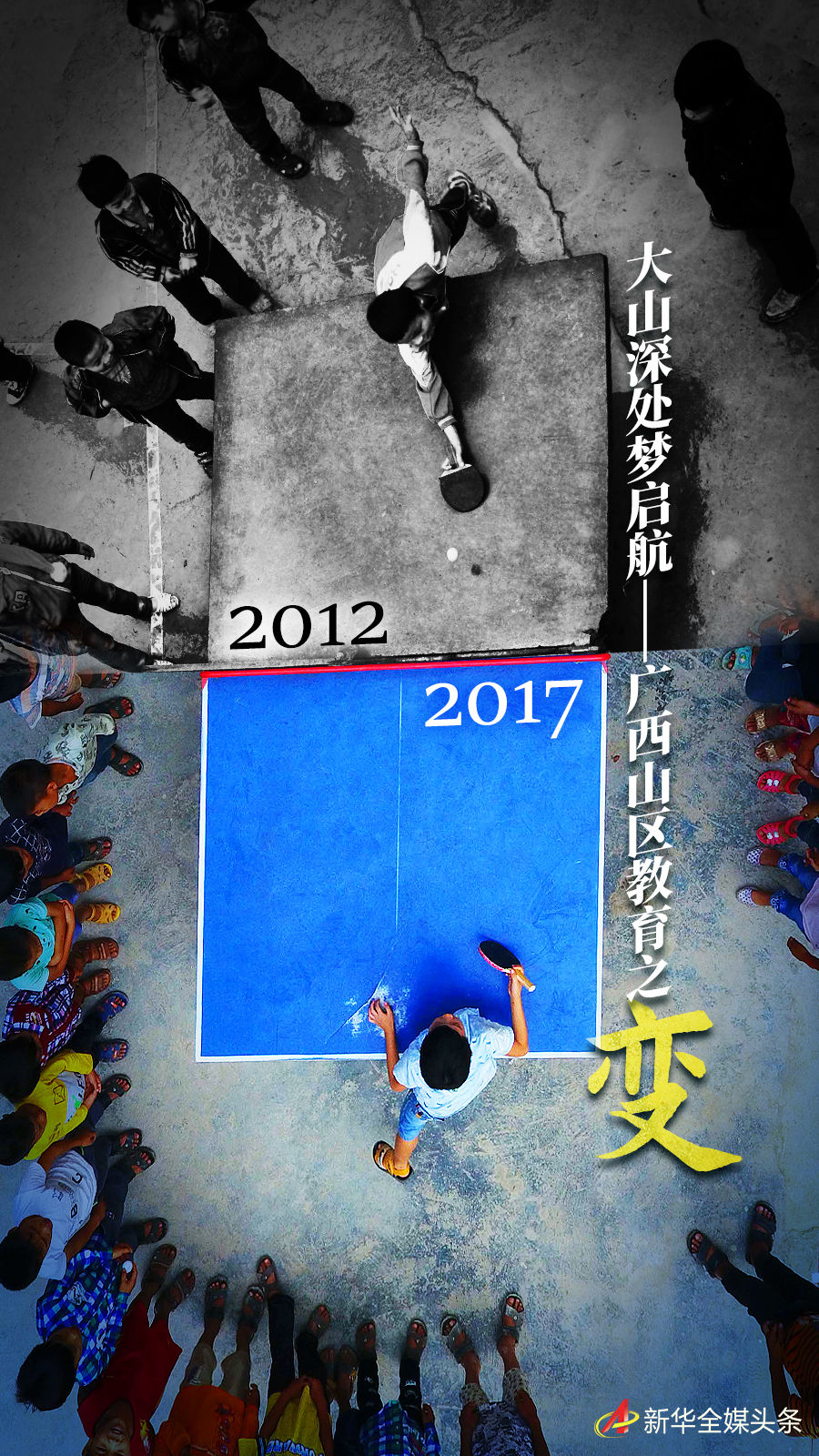 拼版照片:上圖為在廣西大化瑤族自治縣板升鄉(xiāng)弄勇小學,孩子們在打乒乓球(2017年9月4日攝,無人機照片);下圖為在弄勇小學,孩子們在打乒乓球(2012年12月26日攝)。新華社記者 黃孝邦 攝