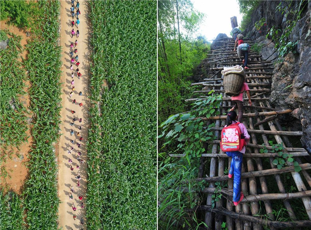 拼版照片:左圖為在廣西大化瑤族自治縣板升鄉(xiāng)弄勇村,孩子們走在放學路上(2019年5月10日攝,無人機照片);右圖為在弄勇村弄頂屯,孩子們扛著生活用具,爬懸梯回家(2012年7月4日攝)。目前,弄勇村所有的屯都已告別沒有公路的歷史。新華社記者 黃孝邦 攝