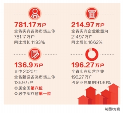 數(shù)據(jù)顯示,截至去年年底,全省實(shí)有各類市場(chǎng)主體781.17萬(wàn)戶,同比增長(zhǎng)11.93%。其中2020年全省新設(shè)各類市場(chǎng)主體136.9萬(wàn)戶,居全國(guó)第6位、中部六省第1位。
