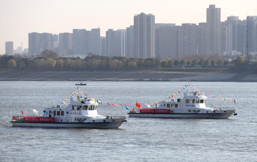 漁政執(zhí)法船隊從長江武漢段江面駛過(2020年12月31日攝)。新華社記者 程敏 攝