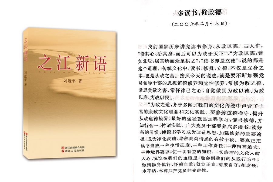 2006年2月17日,時(shí)任浙江省委書記的習(xí)近平用筆名“哲欣”在《浙江日?qǐng)?bào)》“之江新語”專欄發(fā)表題為《多讀書,修政德》的文章。他說,我們國家歷來講究讀書修身、從政以德。廣大黨員干部要養(yǎng)成多讀書、讀好書的習(xí)慣,使讀書學(xué)習(xí)成為改造思想、加強(qiáng)修養(yǎng)的重要途徑,成為凈化靈魂、培養(yǎng)高尚情操的有效手段。