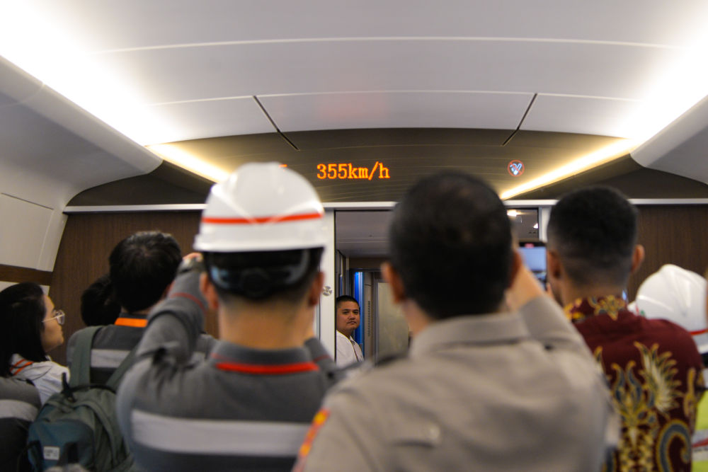6月22日,印度尼西亞雅萬高鐵聯(lián)調(diào)聯(lián)試綜合檢測(cè)列車運(yùn)行時(shí)速首次達(dá)到350公里。這是記者和工作人員拍攝顯示列車時(shí)速的電子屏。新華社記者 徐欽 攝