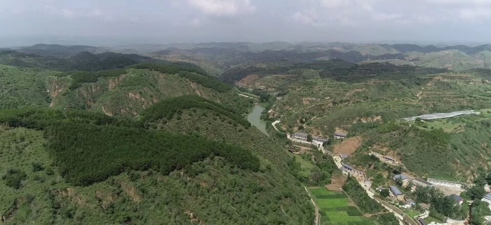 黃土溝壑中的高西溝村滿眼綠色(無人機照片,2023年7月26日)。新華社記者陳昌奇 攝