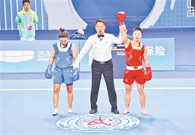 ??李玥瑤(紅)在散打女子52公斤級(jí)半決賽中,以12分優(yōu)勢(shì)戰(zhàn)勝藍(lán)方哈薩克斯坦選手,順利進(jìn)入決賽。 本報(bào)記者 李焱 攝