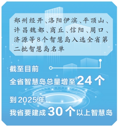 ??11月8日,記者獲悉,省人民政府辦公廳日前公布全省第二批智慧島名單,鄭州經(jīng)開、洛陽(yáng)伊濱、平頂山、許昌魏都、商丘、信陽(yáng)、周口、濟(jì)源等8個(gè)智慧島入選。截至目前,全省智慧島總量增至24個(gè)。