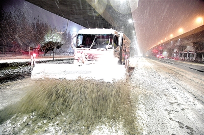 ??12月11日深夜兩點(diǎn),鄭州市公用集團(tuán)出動鏟雪車在北三環(huán)立交下除雪 正觀新聞·鄭州晚報記者 周甬 圖