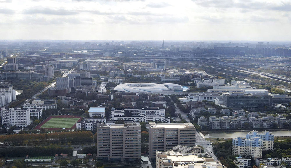 這是2023年11月25日在上海浦東新區(qū)張江科學城拍攝的形如鸚鵡螺的大科學裝置上海光源(中)(無人機照片)。新華社記者 方喆 攝