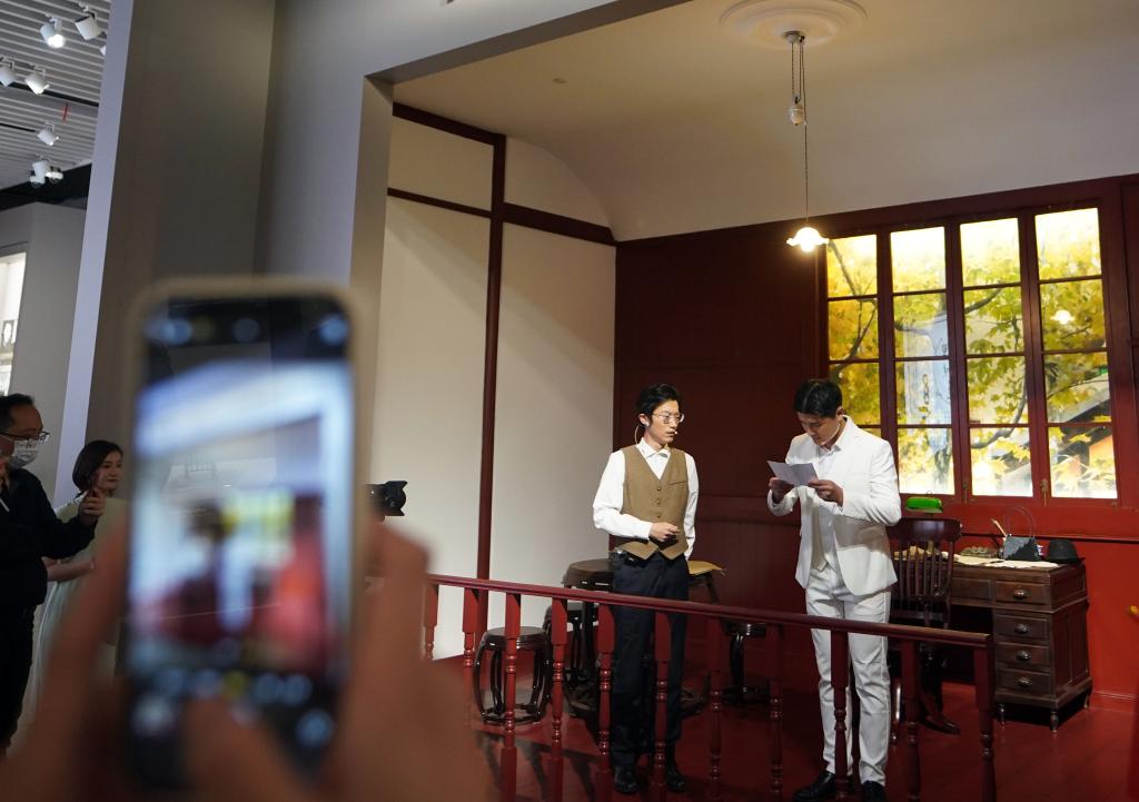 ??2023年5月18日晚,中共一大紀(jì)念館原創(chuàng)的情景黨課《又見新青年》在展廳內(nèi)實(shí)景演出。自2021年中國(guó)共產(chǎn)黨成立100周年之際全新開放以來(lái),中共一大紀(jì)念館對(duì)紅色文化的創(chuàng)新傳播正不斷“圈粉”年輕人。新華社記者 劉穎 攝
