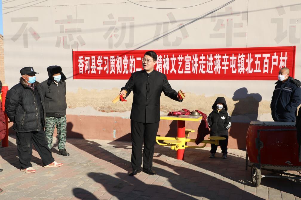 ??河北省香河縣文化館的文藝工作者張?chǎng)毋懺谙愫涌h蔣辛屯鎮(zhèn)北五百戶村進(jìn)行黨的二十大精神“快板宣講”(2022年12月13日攝)。新華社發(fā)