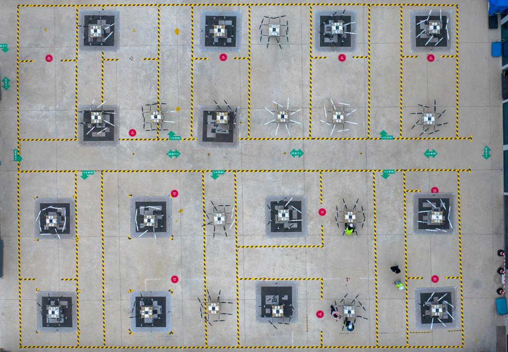 ??在豐翼無人機(jī)運(yùn)營中心,地勤人員對無人機(jī)進(jìn)行起飛前的檢查(無人機(jī)照片)。