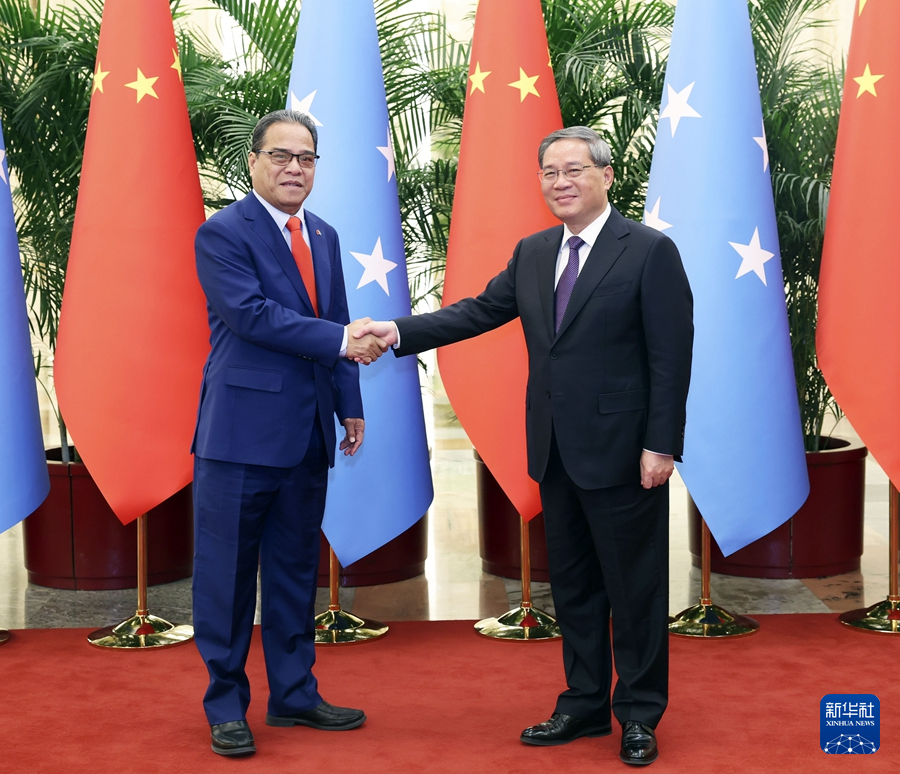 ??4月10日上午,國(guó)務(wù)院總理李強(qiáng)在北京人民大會(huì)堂會(huì)見來華進(jìn)行國(guó)事訪問的密克羅尼西亞聯(lián)邦總統(tǒng)西米納。新華社記者 劉衛(wèi)兵 攝