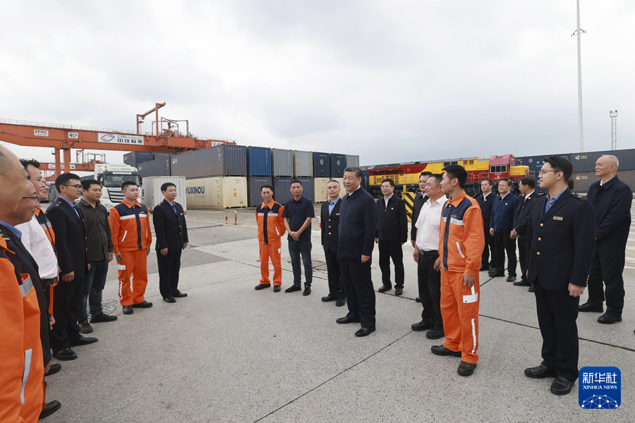 ??4月22日至24日,中共中央總書(shū)記、國(guó)家主席、中央軍委主席習(xí)近平在重慶考察。這是22日下午,習(xí)近平在重慶國(guó)際物流樞紐園區(qū)重慶鐵路集裝箱中心站考察。新華社記者 岳月偉 攝