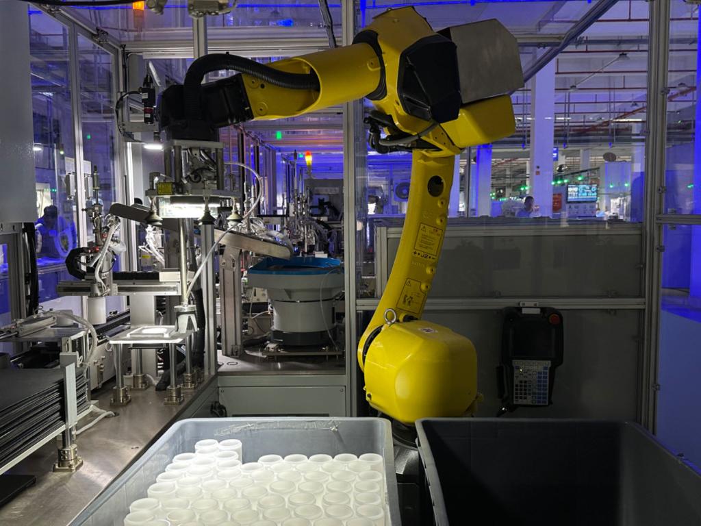 ??南安一家衛(wèi)浴企業(yè)生產(chǎn)線上,機械臂正在抓取過濾器零件。新華社記者 龐夢霞 攝