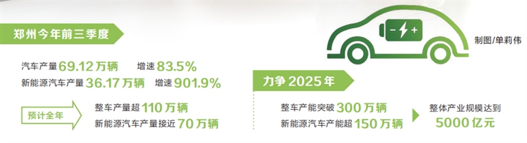 “今年前三季度,鄭州汽車產(chǎn)量69.12萬輛、增速83.5%,新能源汽車產(chǎn)量36.17萬輛、增速901.9%。預(yù)計全年整車產(chǎn)量超110萬輛,新能源汽車產(chǎn)量接近70萬輛?!编嵵菔姓嚓P(guān)負(fù)責(zé)人表示,鄭州正在加快建設(shè)全國重要的新能源及智能網(wǎng)聯(lián)汽車研發(fā)和生產(chǎn)基地,力爭2025年整車產(chǎn)能突破300萬輛、新能源汽車產(chǎn)能超150萬輛,整體產(chǎn)業(yè)規(guī)模達(dá)到5000億元。
